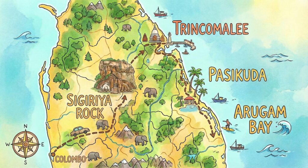 Location of Trincomalee, Pasikuda, Arugam Bay