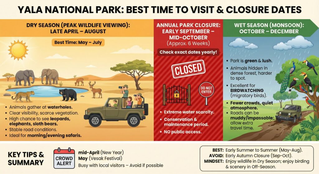 The best season to visit Yala National Park is generally during Sri Lanka’s dry season.