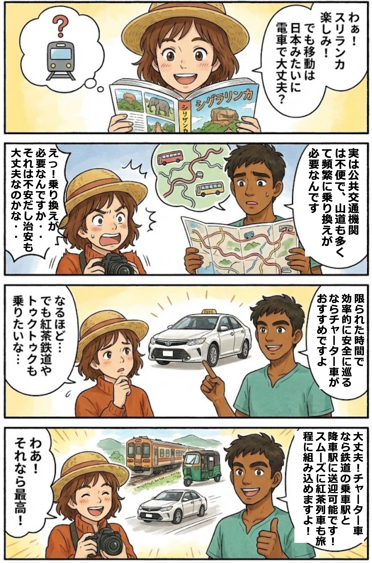スリランカ国内の観光移動では、時間を有効活用し複数都市を回るのに最も便利な移動手段として広く利用されています。