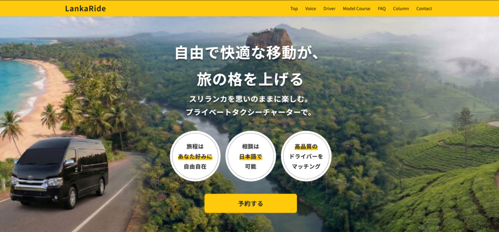 | 2位 | ランカライド(LankaRide) | 日本人スタッフ常駐◎ 日本語ドライバー多数在籍 | ランカライドは現地Chari Travels and Tours Pvt Ltdとのドライバーマッチングをするオンラインプラットフォーム。日本語での旅程相談もOK。 |